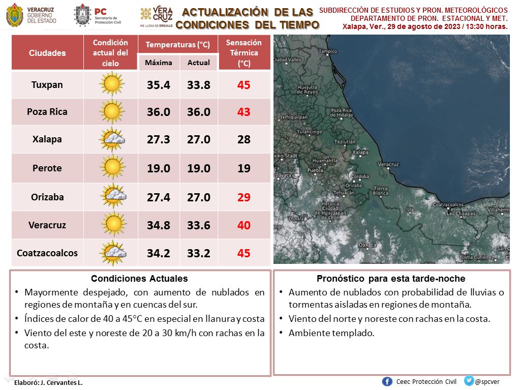 Actualización condiciones del estado del tiempo en Veracruz, donde las condiciones son de temperatura alta y ambiente bochornoso en especial en llanuras y costas. Los nublados incrementan en regiones de montaña del centro y en el sur. Viento del este y noreste moderado.