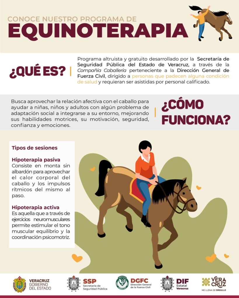En el Gobierno del Ing. Cuitláhuac García Jiménez, trabajamos de manera conjunta para impulsar políticas públicas que garanticen la seguridad, bienestar de toda la población, por ello la SSP en coordinación con el DIF a través del CRISVER, te invitan al Programa de Equinoterapia.