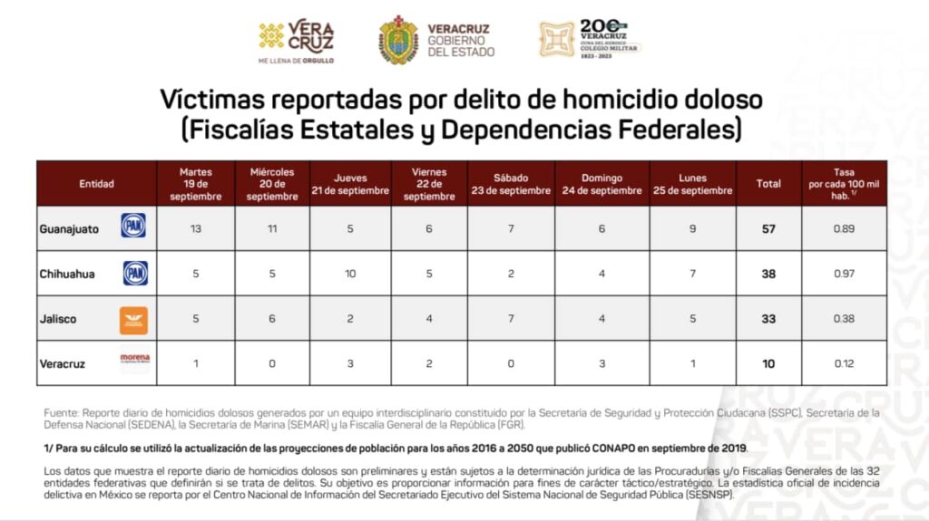 Todos los días llevamos a cabo la mesa de trabajo y toma de decisiones sobre temas de seguridad. Los apoyos económicos que se otorgan directamente para bienestar de la población permiten construir a mediano plazo la tranquilidad y la paz social, porque también son actos de justicia. Adicionalmente a esto sintonizarnos con las políticas federales nos dan muchas ventajas, por ejemplo en las estrategias para reducir cada vez más el número de homicidios; les muestro esta tabla donde Veracruz está cada vez más lejos de los primeros lugares en que nos dejaron los gobiernos anteriores.