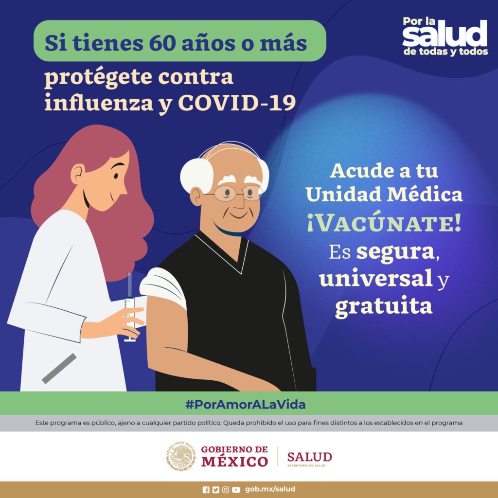 Si tienes 60 años o más es importante que te apliques las vacunas contra #Influenza y #COVID19; cuidar de ti, es cuidar de los demás