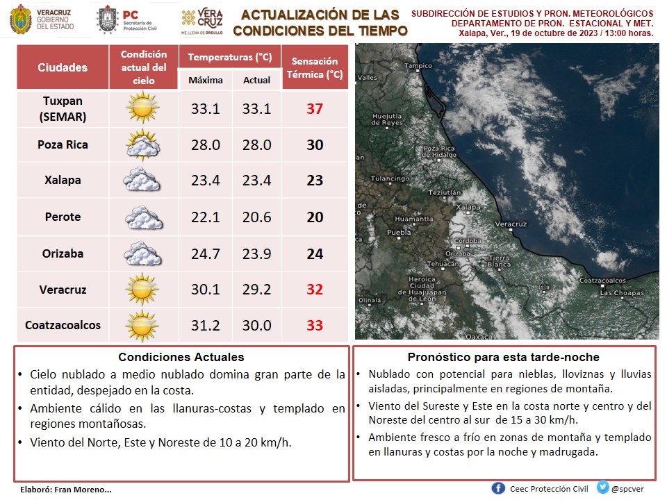 Aumento de nublados, posibilidad de lloviznas y lluvias ligeras en regiones de montaña, así como, nieblas o neblinas, disminuyendo la temperatura.