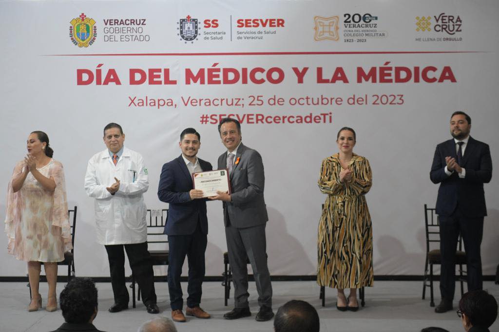 En el marco del Día de la Médica y el Médico esta tarde entregamos la medalla al mérito profesional “Dr. Pedro Rendón Domínguez” al Doctor Roberto Peralta Juárez por su trabajo y trayectoria al cuidado de la salud de los veracruzanos.