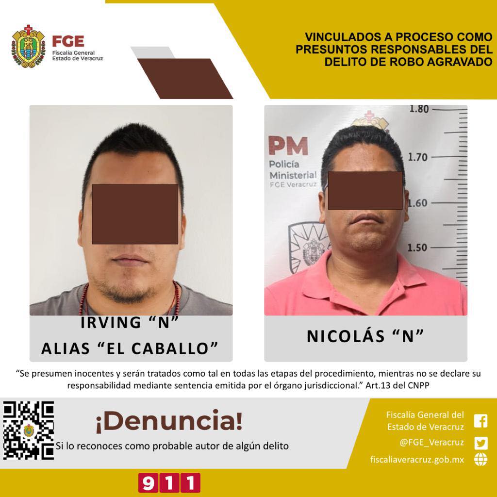 Xalapa, Ver., 26 de octubre 2023.- La Fiscalía de Investigaciones Ministeriales obtuvo vinculación a proceso en contra de Irving “N” alias “El Caballo” y Nicolás “N” como presuntos responsables del delito de robo agravado cometido en agravio de una persona moral ubicada en el municipio de Tierra Blanca.