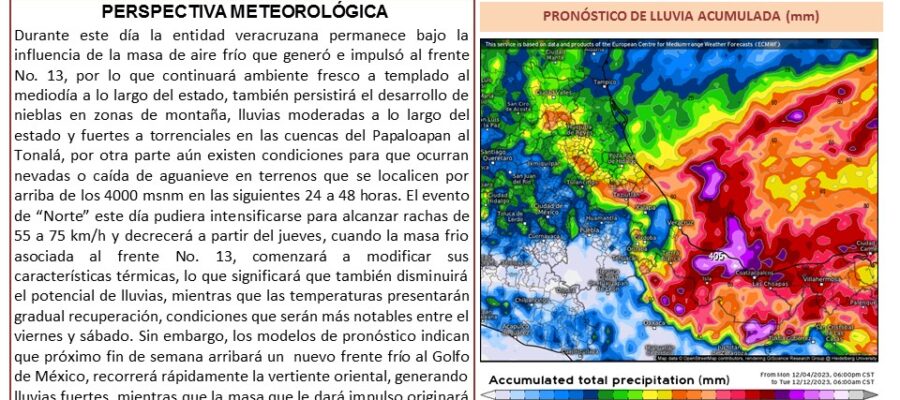 Hoy la entidad veracruzana permanece bajo los efectos de la masa de aire frío que impulsó al #FF13. Vier-Sáb: Condiciones
