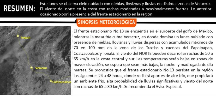 Hoy la entidad veracruzana permanece bajo los efectos de la masa de aire frío que impulsó al #FF13. Vier-Sáb: Condiciones