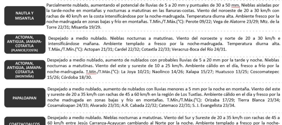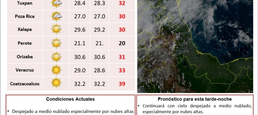 Domina nubosidad alta y de poco espesor, surada en Orizaba, Los Tuxtlas y cuenca baja del Coatzacoalcos, además de ambiente