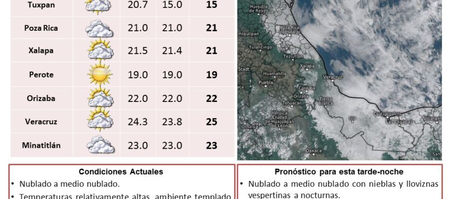 Actualización de las condiciones del estado del tiempo en Veracruz donde domina cielo nublado a medio nublado, ligera recuperación de